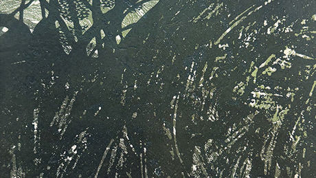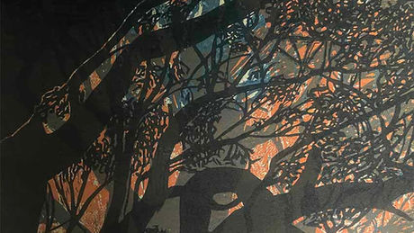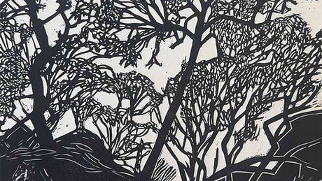 Seeing the Woakwine Cutting while on the Limestone Coast Artist Retreat tour profoundly affected how Trudy considered the landscape. It was a great feat to make the cutting by a man and his tractor. The effect on the local environment was profound. The drainage of the waters from the swamp lands and accessibility to farming was transformational.Since arriving in the Limestone Coast, Trudy has wanted to discuss in her work how delicate this environment is and how fascinating the interconnection between natural processes of hydrology are and how dependent our communities are on it.As an artist Trudy is trained in the intellectual discourse of art world, but she values more the accessibility of art to the whole community. This artwork is intended to contain visual elements that people can recognise. The thin silhouette of spindly trees on the horizon is a quintessentially Australian vision. People drive through the Region often see a tree plantation or remnant bush land along the side of the road.After taking all this into consideration, Trudy went out into the paddocks and drew the tree lines she observed. She then copied the original drawings and transferred them to plastic plate with permanent Texta. The tree line illustrations were etched by hand with an etching needle/tool into the soft plastic plate, which was then inked and passed through the press to print as the fourth layer of image onto the paper. This work is intended to be seen in the context of the Cannon of Australian Minimalist Landscape Art, but it is also intended to contain enough visual information that anyone is reminded of landscapes they have seen. The work is also meant to provoke thoughts about the landscape and how we use it for farming, mining, and building materials. This work is part of a larger series of works that can be seen at the Suttontown Chapel Studio by appointment.